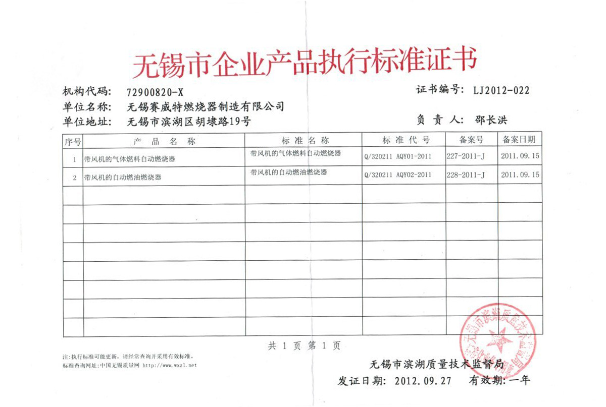 企业产品执行标准证书